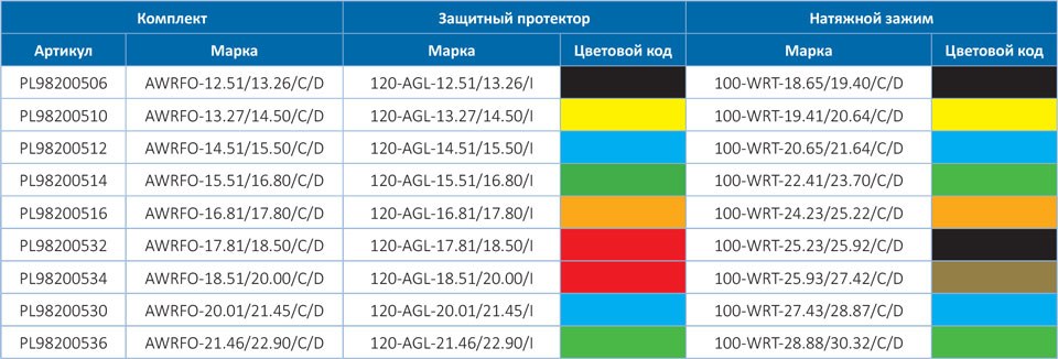 Цветовой код в таблице помогает идентифицировать зажимы по диапазону диаметров провода (троса).
