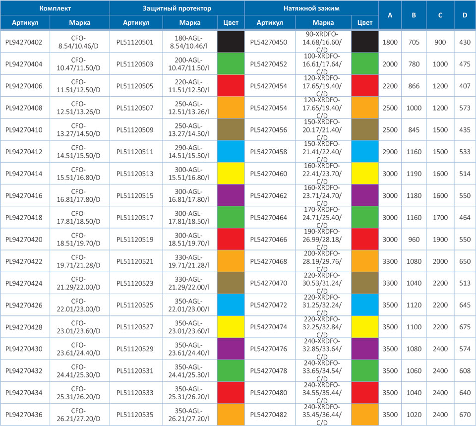 Для получения информации о зажимах с диаметром кабеля, не указанным в таблицах, обратитесь в представительство компании PLP.