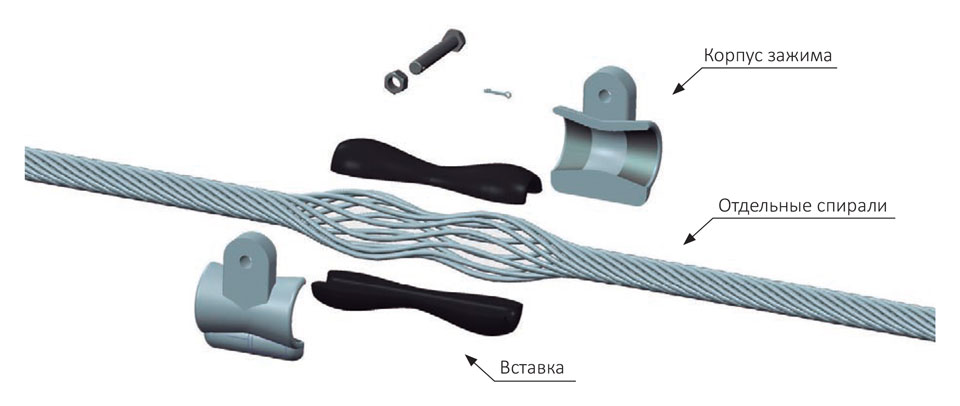 - Минимизированы изгибающие усилия в точке выхода провода из зажима, исключены перетирания проволок верхнего повива.